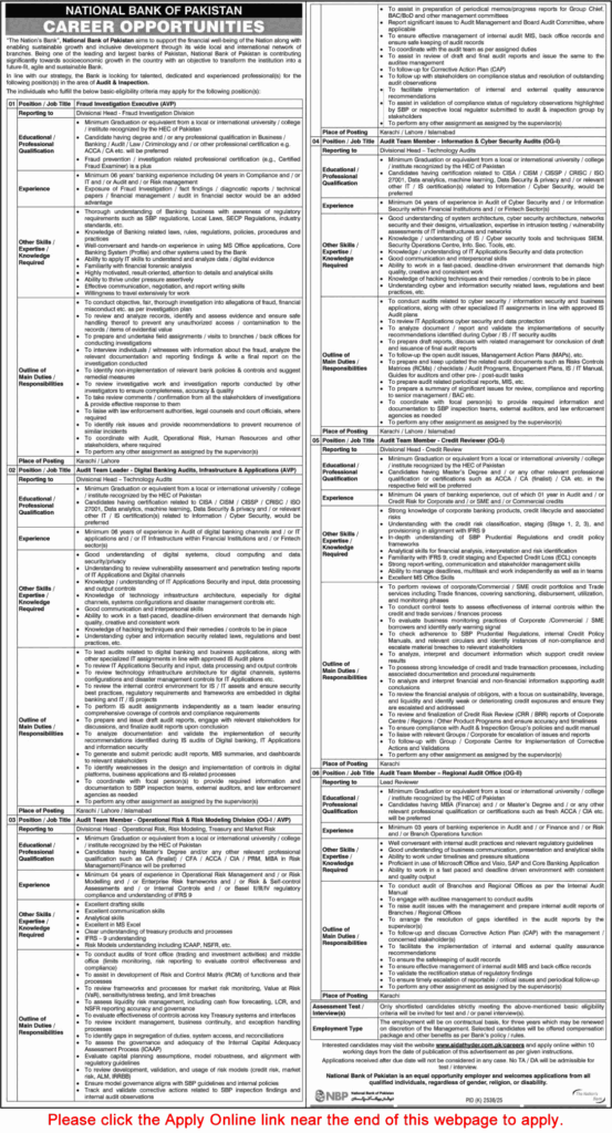 According to the latest advertisement, National Bank of Pakistan is hiring for the following positions:
