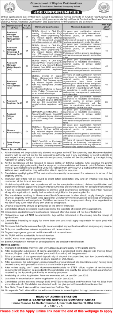 Apply onlinehttps://wssck.org.pk/careers/ as soon as possible and do not wait for the last date. Prepare well for the ETEA test and take the first step toward a successful career with WSSC Kohat.